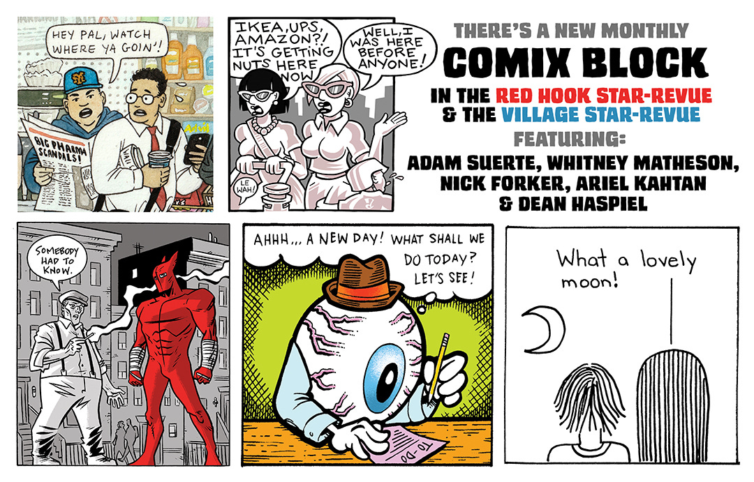 Curated by Brooklyn cartoonist Dean Haspiel, the monthly “Comix Block” features original comics by Haspiel, Nicholas Forker, Ariel Kahtan, Whitney Matheson and Adam Suerte. All five of the artists have studios in Red Hook, Brooklyn.